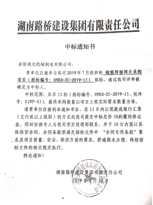 岳阳鸿光机械制造有限公司: 贵单位应邀参与我司2019年7月组织的钢筋焊接网片釆购项目(招标编号:HNRB-ZC-2O19-15)招标,通过我司评审被确定为中标人。